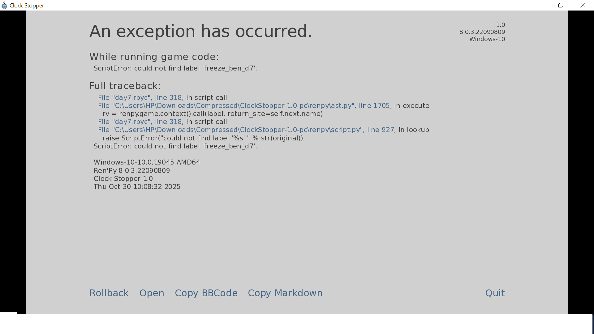 File "C:\Users\HP\Downloads\Compressed\ClockStopper-1.0-pc\renpy\ast.py", line 2115, in execute
